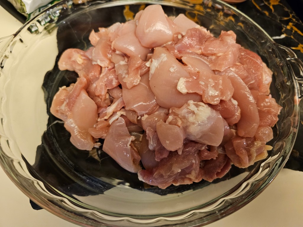 5. Slice the chicken thighs into thin strips and set them aside.