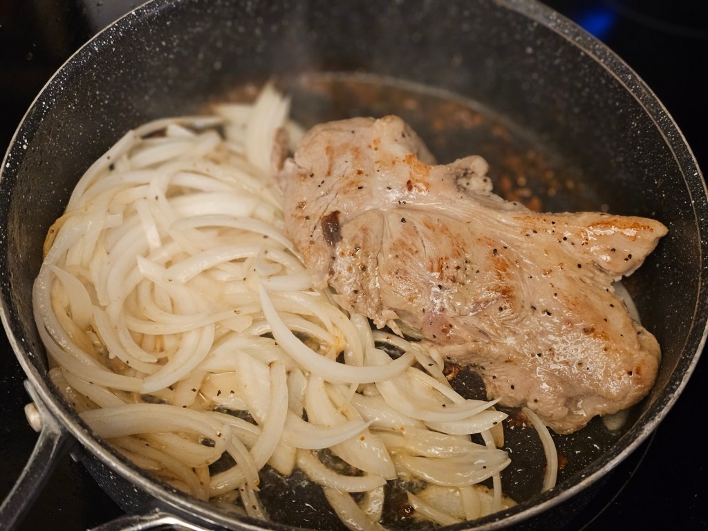 8. After simmering, increase the heat to medium-high and cook uncovered until the liquid has evaporated, and the pork becomes crispy and caramelized.
